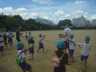 7月13日(水)、晴れわたる空の下で、水遊びをしました。