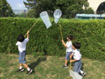 今は、バッタやトンボが多く見つかりますが、かまきりやちょうちょなどの虫を捕まえる子もいて、1年生の子どもたちは暑さに負けず虫捕りに夢中になっています。